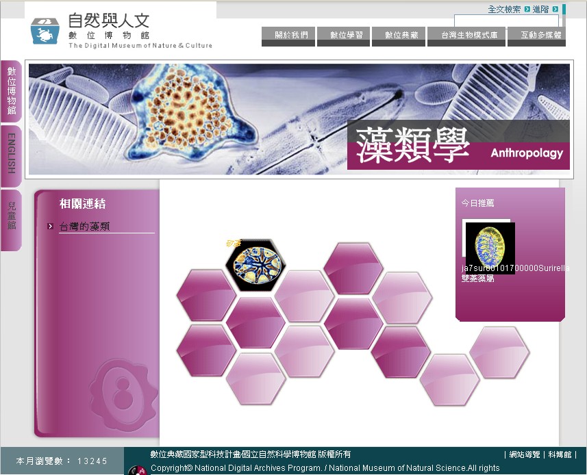 This Algology Digital Museum provides digital resources of diatom. Its website includes the following sections: tour of knowledge database, specimen archives, exhibition by subject and multi-media programs. We also provide links to Taiwan's algological websites.