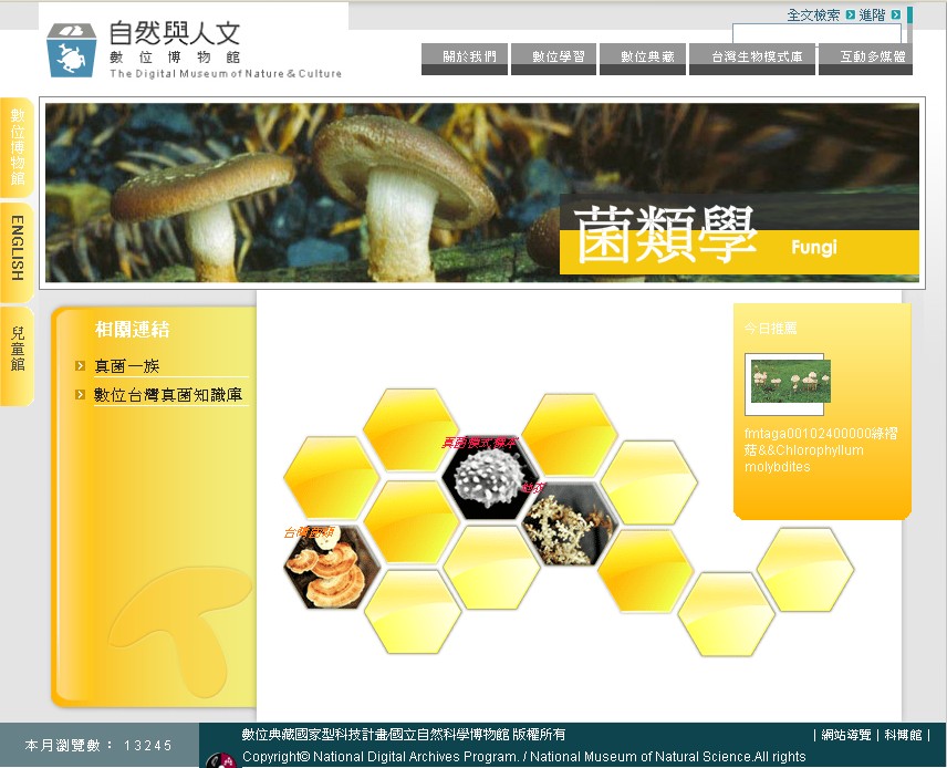 The Mycology Digital Museum provides introduction to fungi (fungous model, specimens and lichen). This website includes the following sections: tour of knowledge database, specimen archives, exhibition by subject and multi-media programs. It also has links to the website of the Family of Fungus as well as other educational websites.