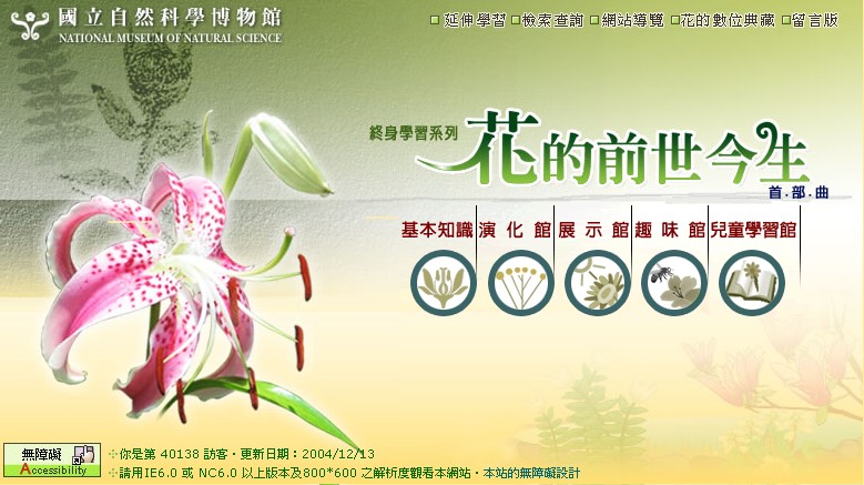 This website has the following sections: introduction, evolution, exhibition, fun activities and kids’ learning. These sections together provide preliminary and advanced information of flower structures, origins, evolution, pollination, features and legends. We also reconstruct virtual scenes of Jurassic and Cretaceous periods with 3-D animation techniques. Therefore, by using various tools such as images, interactive animation, experiments, illustrated stories and games, this website provides users with a friendly and enjoyable learning environment.